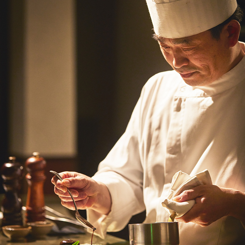 お肉料理やお魚料理はその都度焼いた、出来立てのものを。椀物などの温かいものは、温かいうちに。大切なゲストのみなさまに、いちばんおいしい状態で召し上がっていただくために、ひと皿ひと皿に手間暇を惜しまず、ご用意いたします。