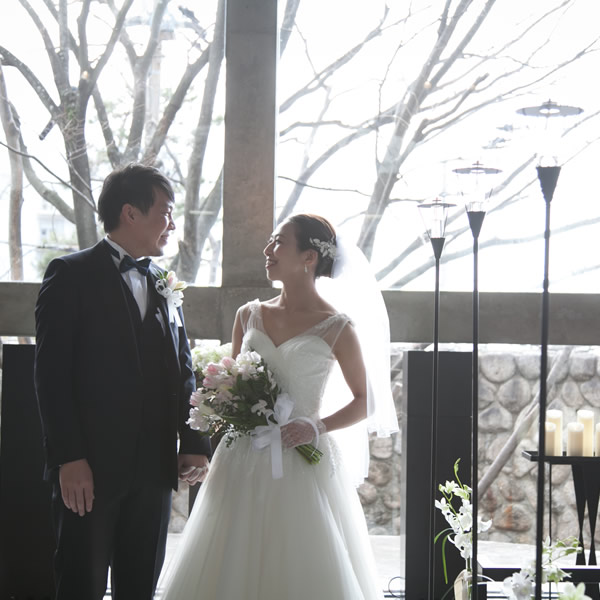 シンプルシックな2月のウエディング安藤建築の直線美とシンボルツリーでもあるケヤキの木の曲線美がアーティスティックな美しさを奏でる2月に挙式をされたおふたり。春を先取りし、チューリップでデザインされたウエディングブーケやパステルにまとめたフラワーコーディネート、柔らかなチュール素材のウエディングドレスを身にまとい神聖な冬の空気の中に、温もりと柔らかさをアイテムで演出されました。